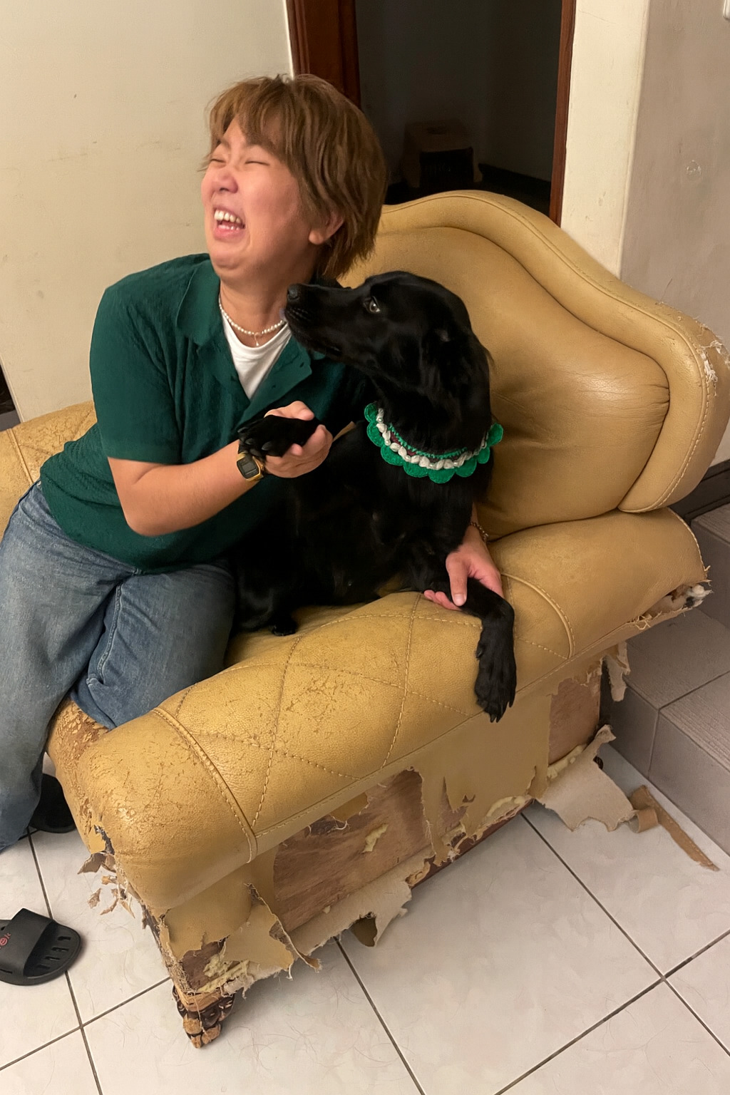 我是那張堅強又破碎的沙發。每天承受黑色小毛孩的跳躍、抓抓和歡樂暴擊。雖然外皮被她愛得千瘡百孔,但看到她和人類一起笑到歪掉,我這張『犧牲系親子裝』沙發也覺得值得了!
