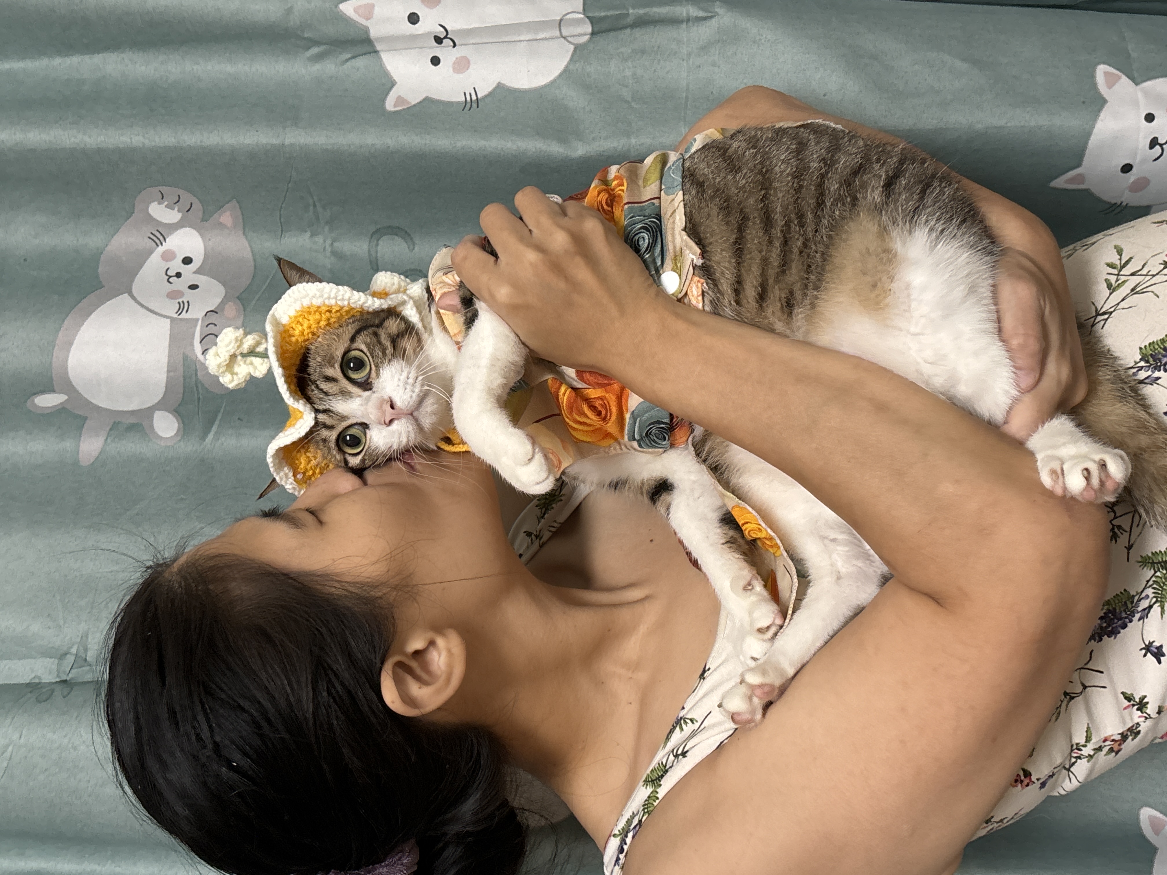 這隻貓咪叫做美美,他是一隻原生型的流浪貓到我手上的時候他只有85克重,沒有開眼,肚臍上還有臍帶還在的狀況下奶大的,本來以為他是一隻白底虎斑,結果越長大才發現原來他是一隻彩色梨花貓個性非常像狗,他本身也是「板橋高中貓研社」的助教貓老師